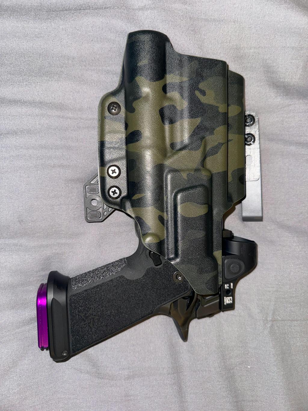 We offer two different muzzle length options designed to accommodate either a 4.5-inch or 5-inch barrel. Since this is an open-ended holster design, you can still carry your 5-inch pistol in a 4.5 holster — the only difference is that the end of the muzzle (or compensator) will be exposed.