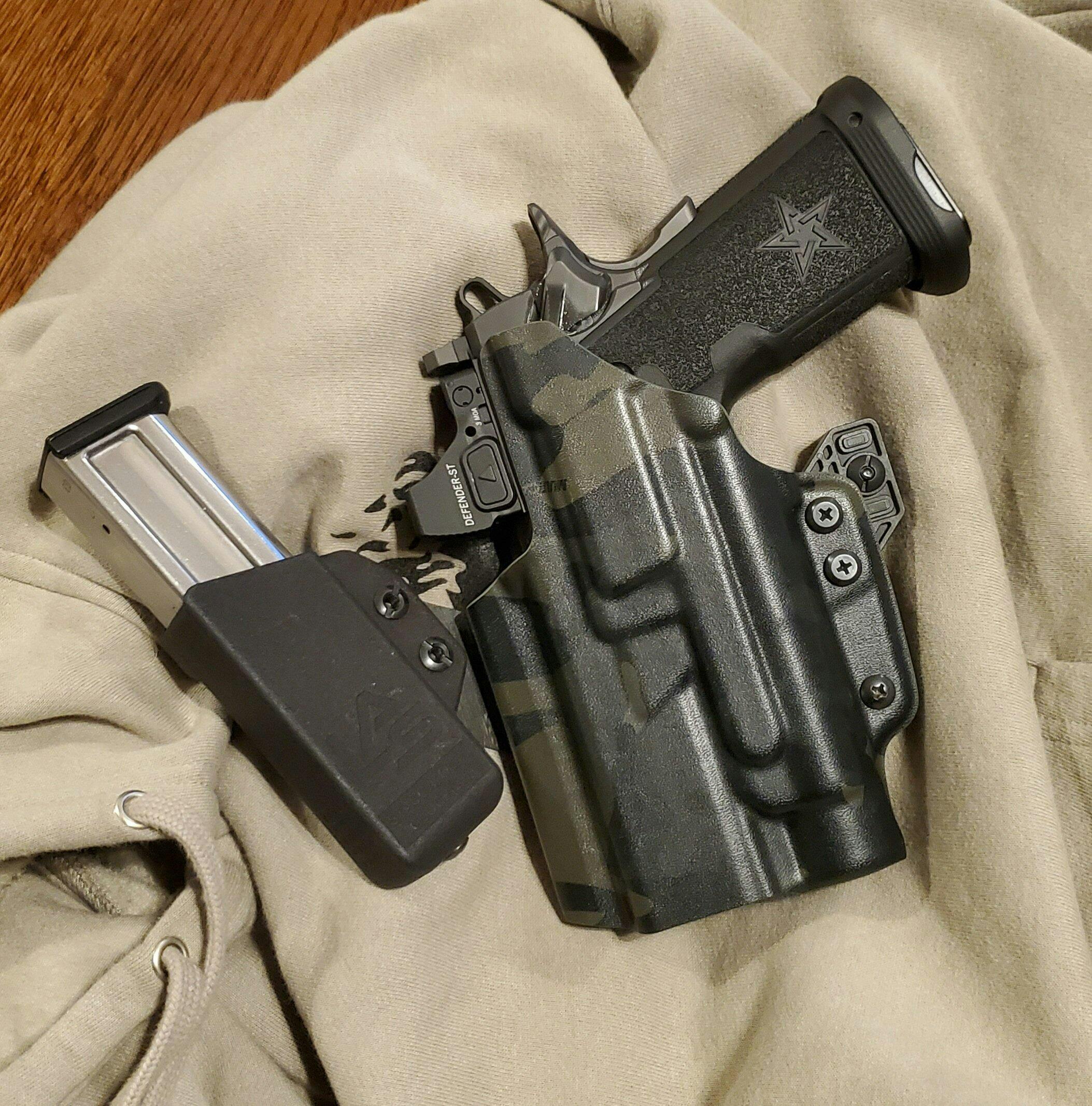 We offer two different muzzle length options designed to accommodate either a 4.5-inch or 5-inch barrel. Since this is an open-ended holster design, you can still carry your 5-inch pistol in a 4.5 holster — the only difference is that the end of the muzzle (or compensator) will be exposed.